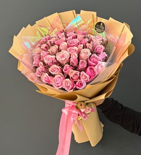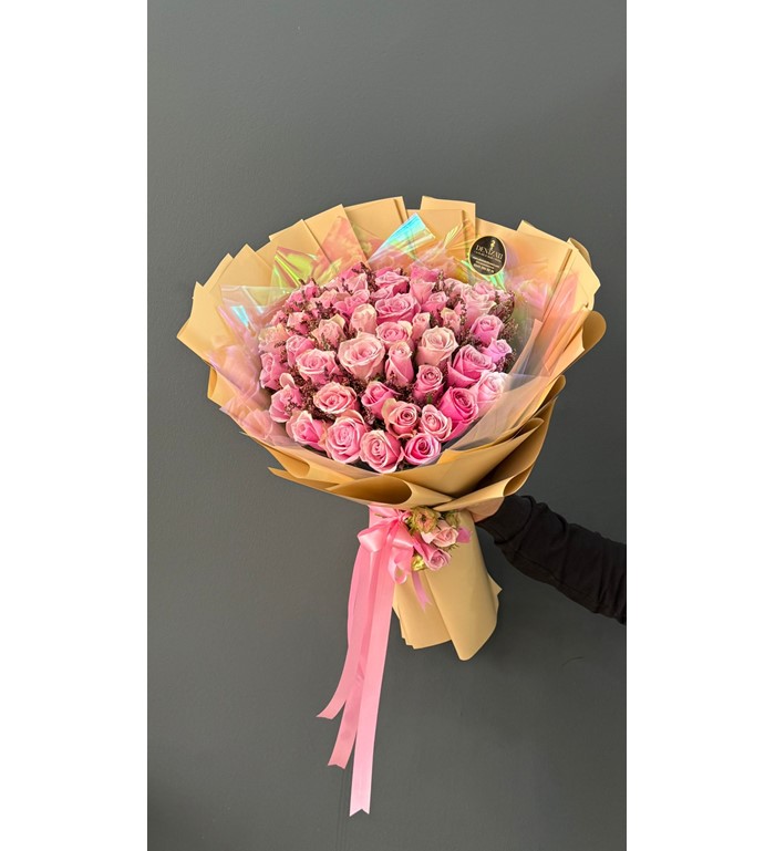 50 adet pembe,1.kalite güllerle hazırlanan buket, uygun tonlarda şık ve modern ambalaj ile süslenerek sunuma hazırlandı. Tanışma, söz- nişan çiçeği olarak tercih edebileceğiniz şık bir üründür. Pembe gül buketi modeli, önünde de güllerle ve fiyonklarla süslenerek özel gün için tercih edilecek şekilde özenle süslendi.